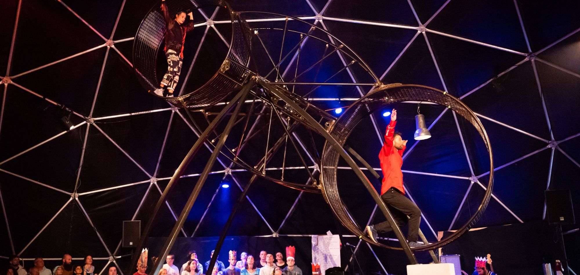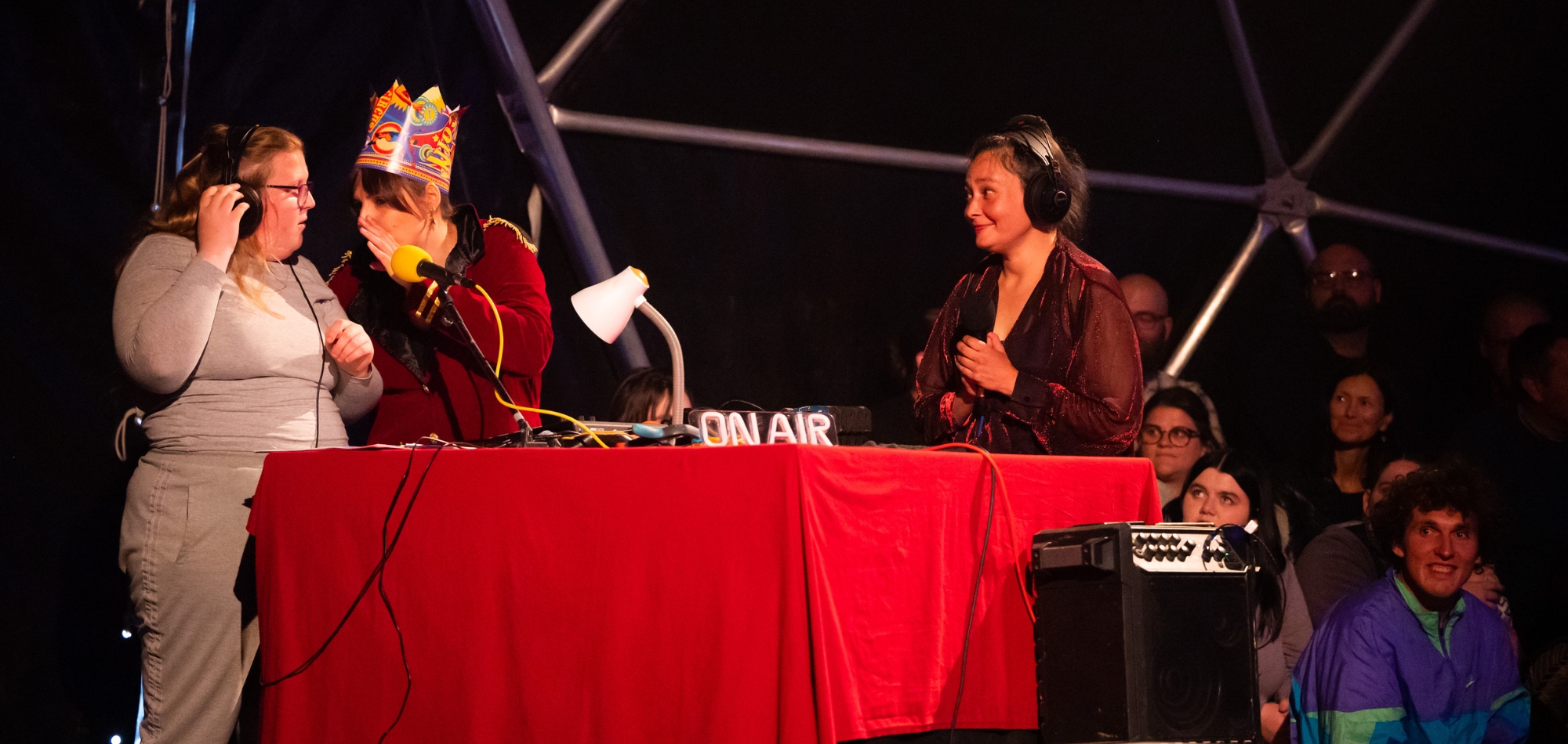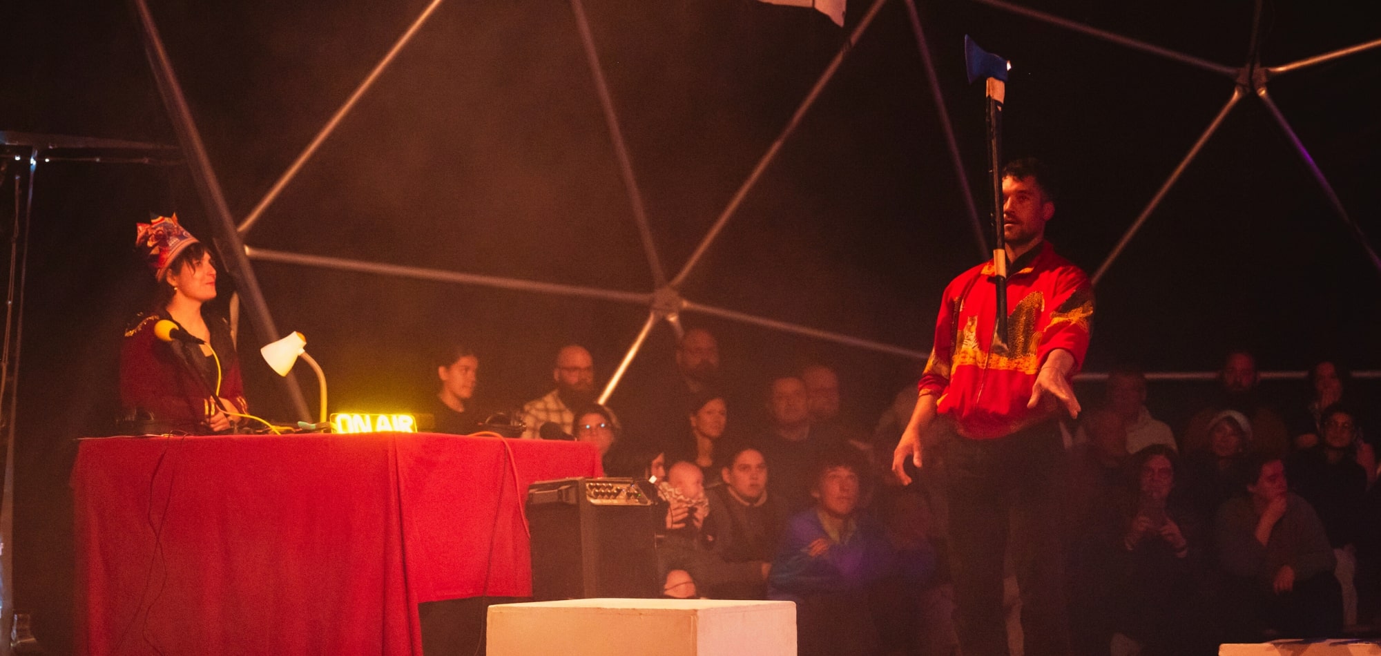 Sur une piste partagée entre les artistes de Galapiat Cirque et les jeunes, chacun·e a pu trouver sa place pendant la restitution : certain·es se sont lancé·e·s dans des numéros de roue de la mort ou de lancer de couteaux et de haches, d’autres ont pris la parole pendant les pauses radiophoniques. Nous avons aussi dansé, chanté et servi des pizzas faites maisons au public.