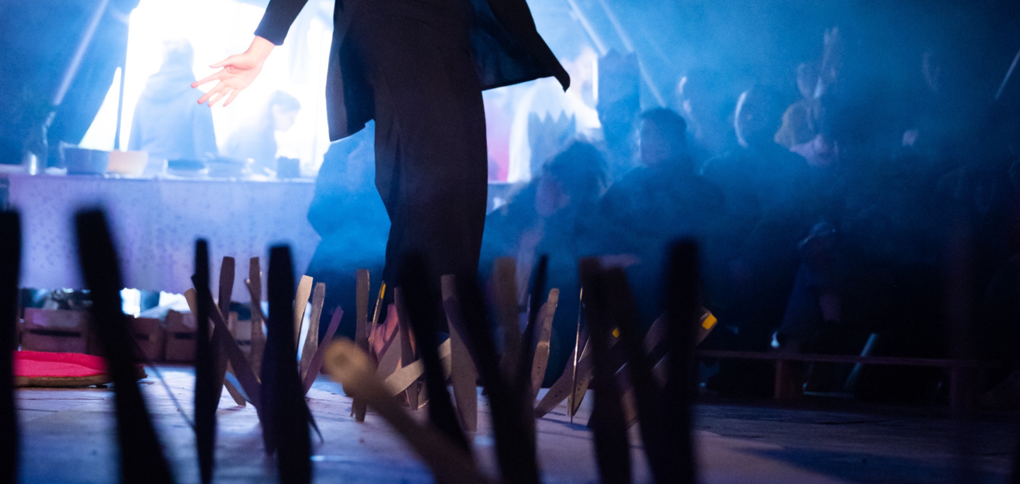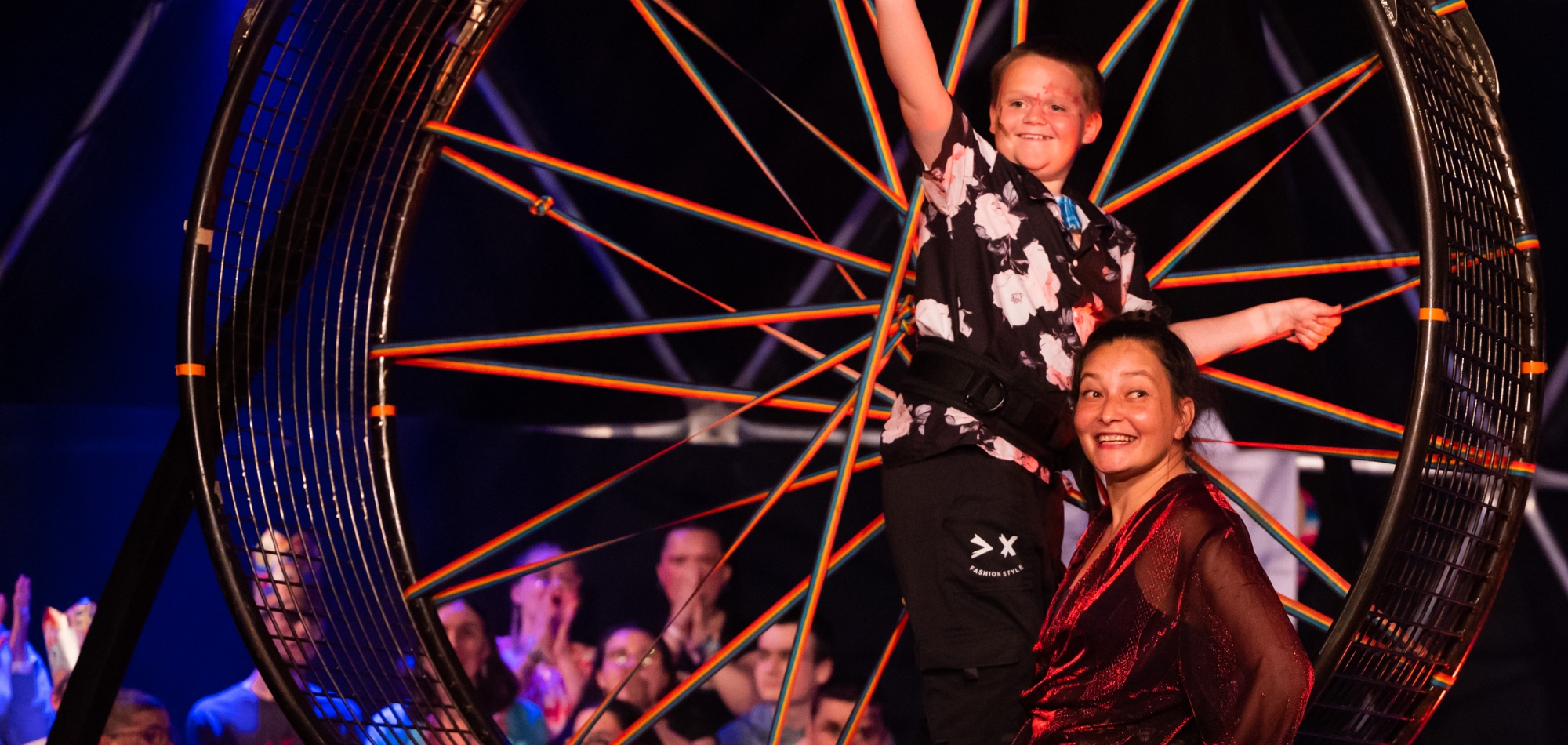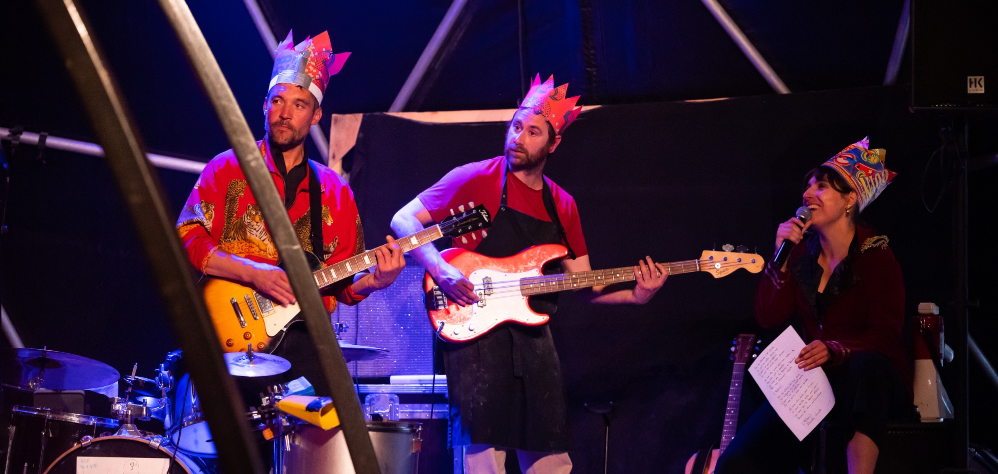 Sur une piste partagée entre les artistes de Galapiat Cirque et les jeunes, chacun·e a pu trouver sa place pendant la restitution : certain·es se sont lancé·e·s dans des numéros de roue de la mort ou de lancer de couteaux et de haches, d’autres ont pris la parole pendant les pauses radiophoniques. Nous avons aussi dansé, chanté et servi des pizzas faites maisons au public.